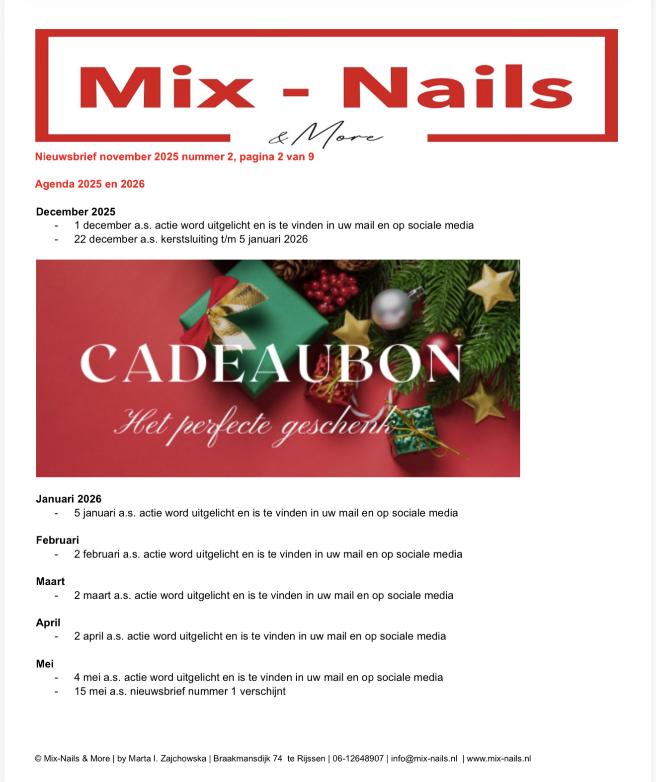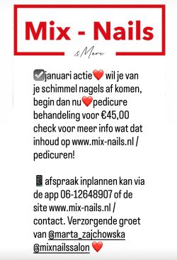 Mix-Nails & More vermeldt alle prijzen van behandelingen en producten zichtbaar op de site. De gemelde prijzen zijn inclusief BTW. Mix-Nails & More vermeldt prijswijzigingen 30 dagen voor de ingangsdatum duidelijk zichtbaar op de site. Aanbiedingen in advertenties zijn geldig in de aangegeven looptijd en/of zolang de voorraad strekt. De cliënt dient direct na afloop van de behandeling de betaling van de behandeling en eventuele producten contant of per pin te voldoen. Uitsluitend na overleg met Mix-Nails & More is betaling in termijnen mogelijk.