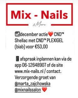 Mix-Nails & More is niet aansprakelijk voor schade, van welke aard ook, ontstaan doordat Mix-Nails & More is uitgegaan van door de cliënt verstrekte onjuiste en/of onvolledige informatie over relevante lichamelijke aandoeningen, medicijngebruik, werkzaamheden of vrijetijdsbesteding. Mix-Nails & More is niet aansprakelijk voor verlies, diefstal of beschadiging van persoonlijke eigendommen die bij de cliënt thuis aanwezig zijn. Mix-Nails & More te Rijssen, Marta I. Zajchowska, de eigenaresse, is niet aansprakkelijk voor het aanbrengen van schade, als zijnde schimmel, bacteriën, allergieën of TPO Dimethyltolylamine en Trimethylbenzoyl diphenylphosphine oxide aan de teen nagels, hand nagels en of huid. Het merk CND™ shellac gel lak en CND™ plexigel, van de producten die gebruikt worden in de salon, zijn dan ook vrij van TPO en HEMA en kunnen geen schade aanbrengen aan bovengenoemde.
