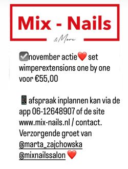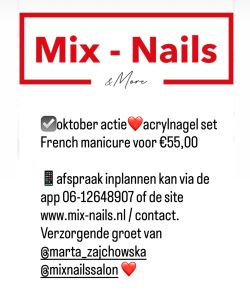 Mix-Nails & More vermeldt alle prijzen van behandelingen en producten zichtbaar op de site. De gemelde prijzen zijn inclusief BTW. Mix-Nails & More vermeldt prijswijzigingen 30 dagen voor de ingangsdatum duidelijk zichtbaar op de site. Aanbiedingen in advertenties zijn geldig in de aangegeven looptijd en/of zolang de voorraad strekt. De cliënt dient direct na afloop van de behandeling de betaling van de behandeling en eventuele producten contant of per pin te voldoen. Uitsluitend na overleg met Mix-Nails & More is betaling in termijnen mogelijk.